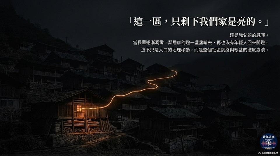 螢幕上換成了一條陡峭下滑的曲線:過去三十年間,部落人口流失了 57%。數字背後,是我親身經歷、冷徹透骨的寂靜。我想起父親曾在深夜裡的感嘆:「以前晚上看出去,很多戶人家都有燈;現在,燈火一盞一盞熄滅,只剩下我們家是亮的。」