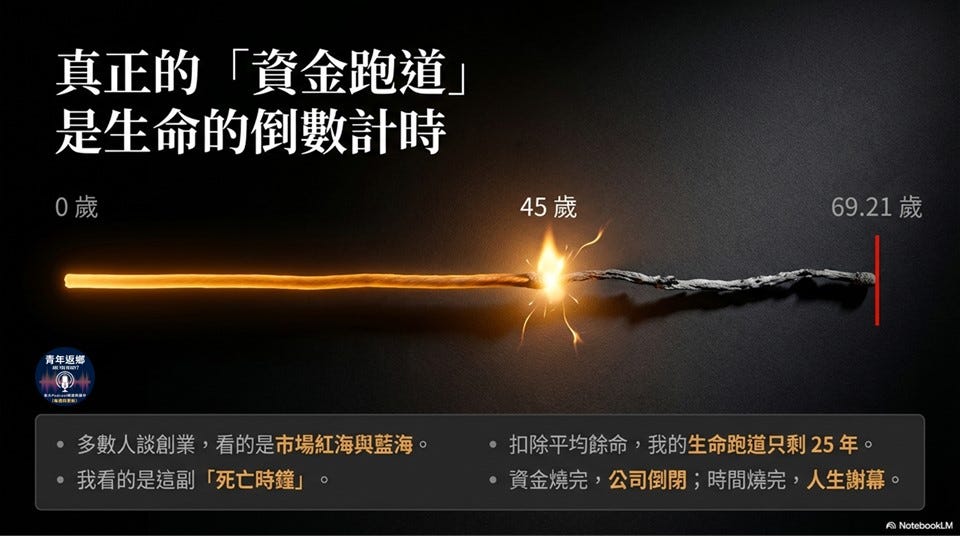 根據內政部統計,原住民男性的平均餘命是 69.21 歲。現年 45 歲的我,如果單以這個數字衡量,人生的跑道大約只剩下 25 年。在商業世界裡,新創公司看的是帳面上的現金還能燒幾個月;但在我的邏輯裡,我算的是生命還剩多少額度。